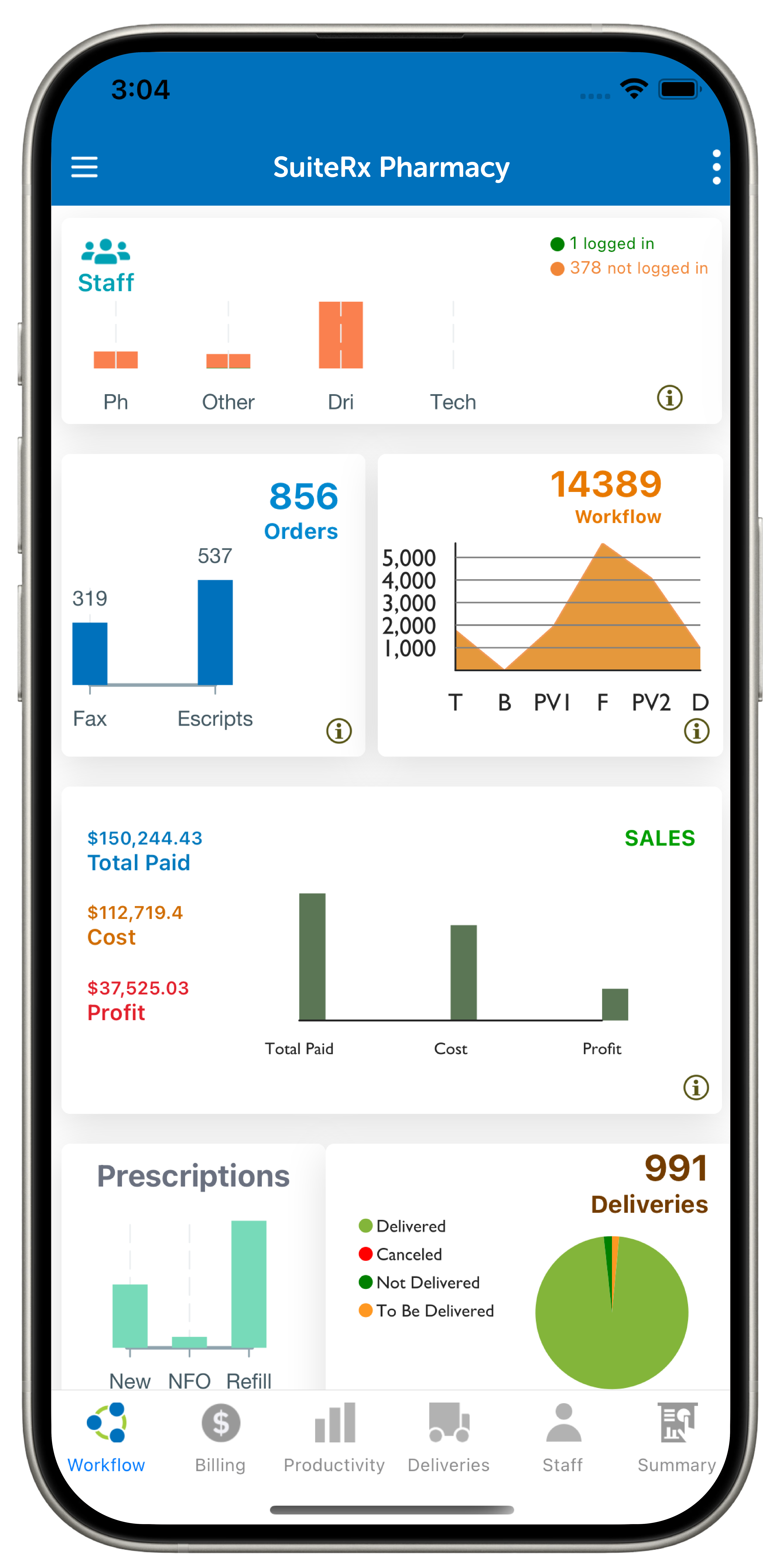 The SRxAffinity application provides views of almost real-time business performance by aggregating metrics from SRx dispensing data and converting it into actionable data for single or multi-site locations. Use tools that allow you to filter and view your data with an at-a-glance comparison of business metrics. View pre-built or tailored custom reports that you currently use in SRx. Experience day by day control by viewing data so you are prepared for anything. Operations are broken down by workflow, billing, productivity, deliveries, staff, and summary categories. Monitor trends, discover anomalies, identify strengths and weaknesses to examine the health of your business.
